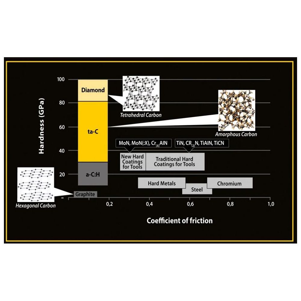 Povlak Tetrahedral Amorphous Carbon (ta-C) je pokročilý povlak DLC (Diamond Like Carbon) aplikovaný na povrchy pouzder a válečků řetězu HPE, který kombinuje vysokou tvrdost s nízkým koeficientem tření.