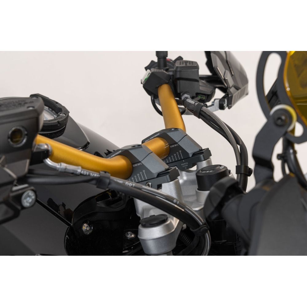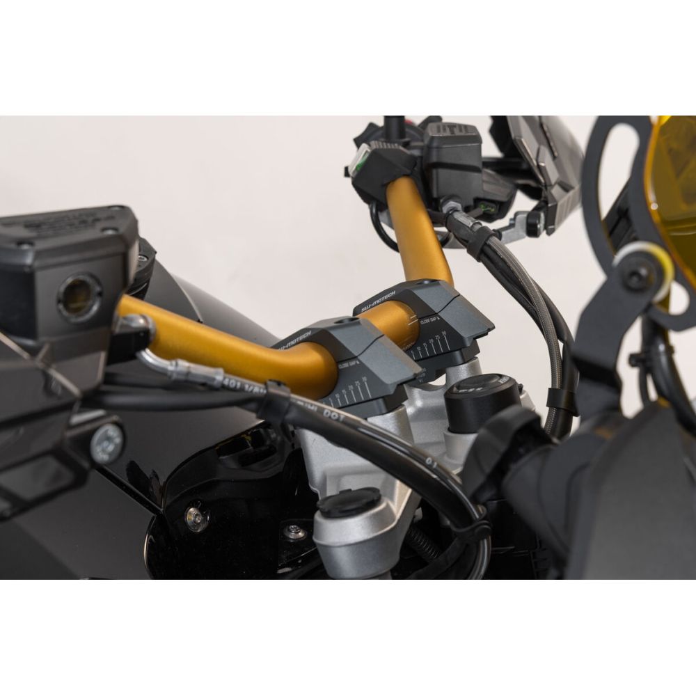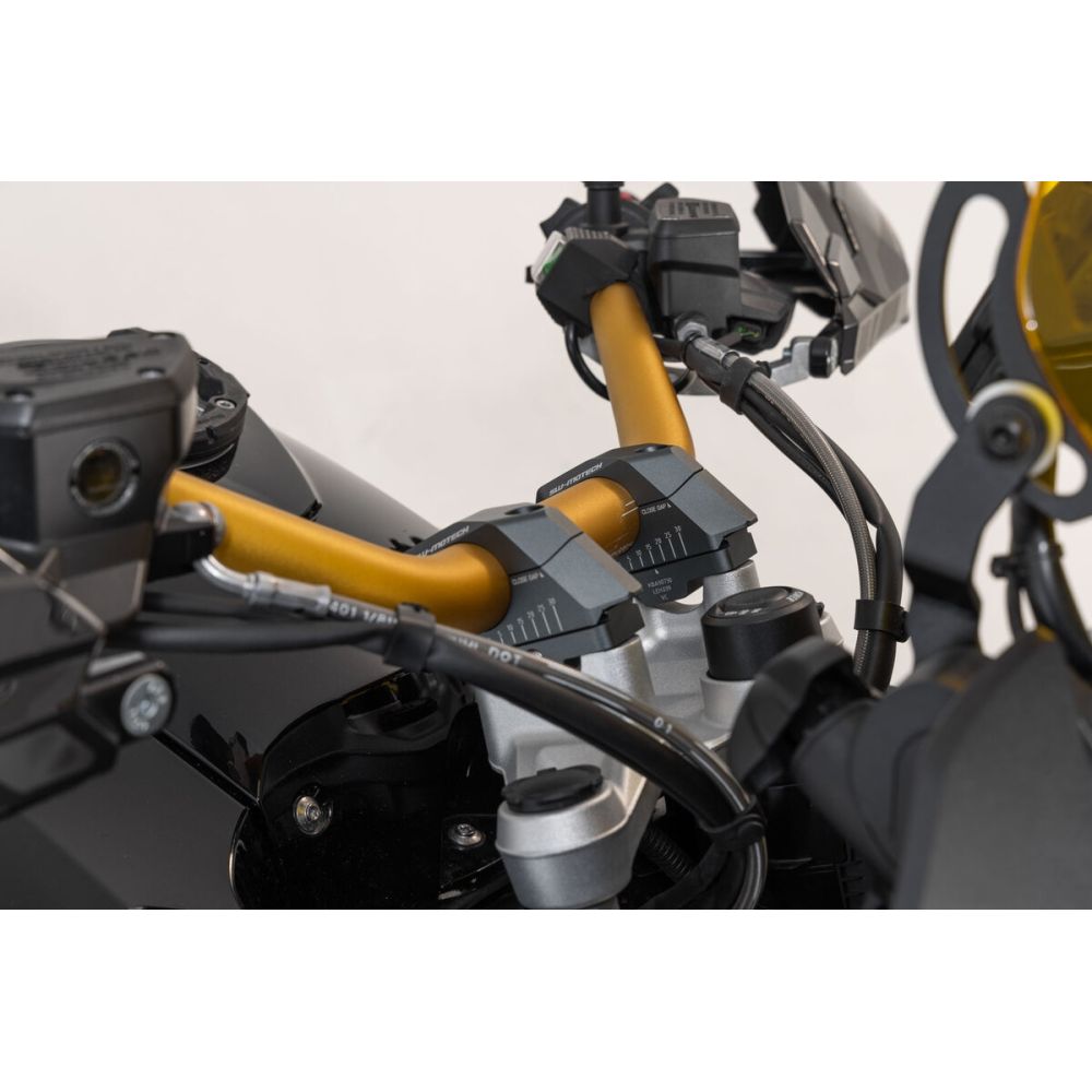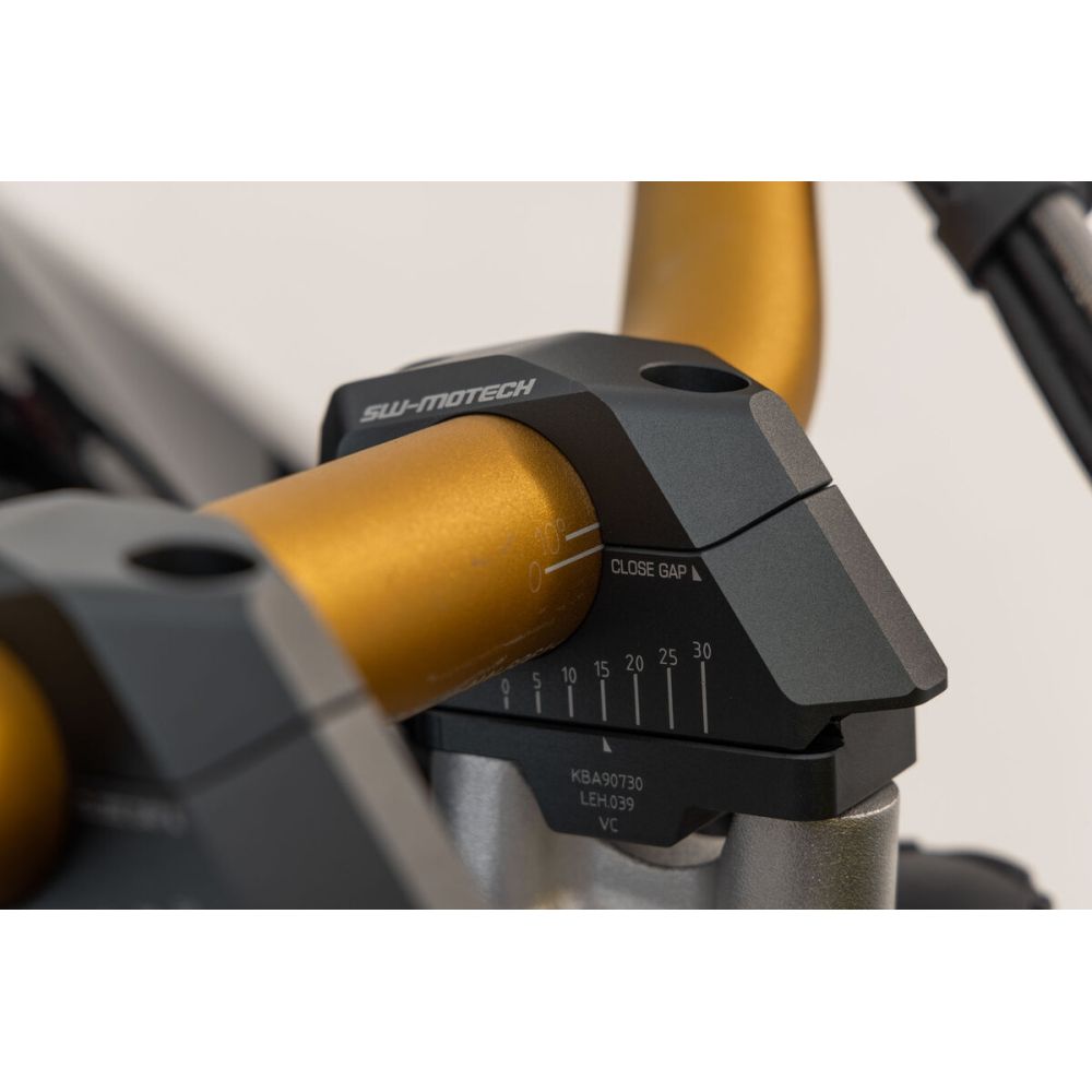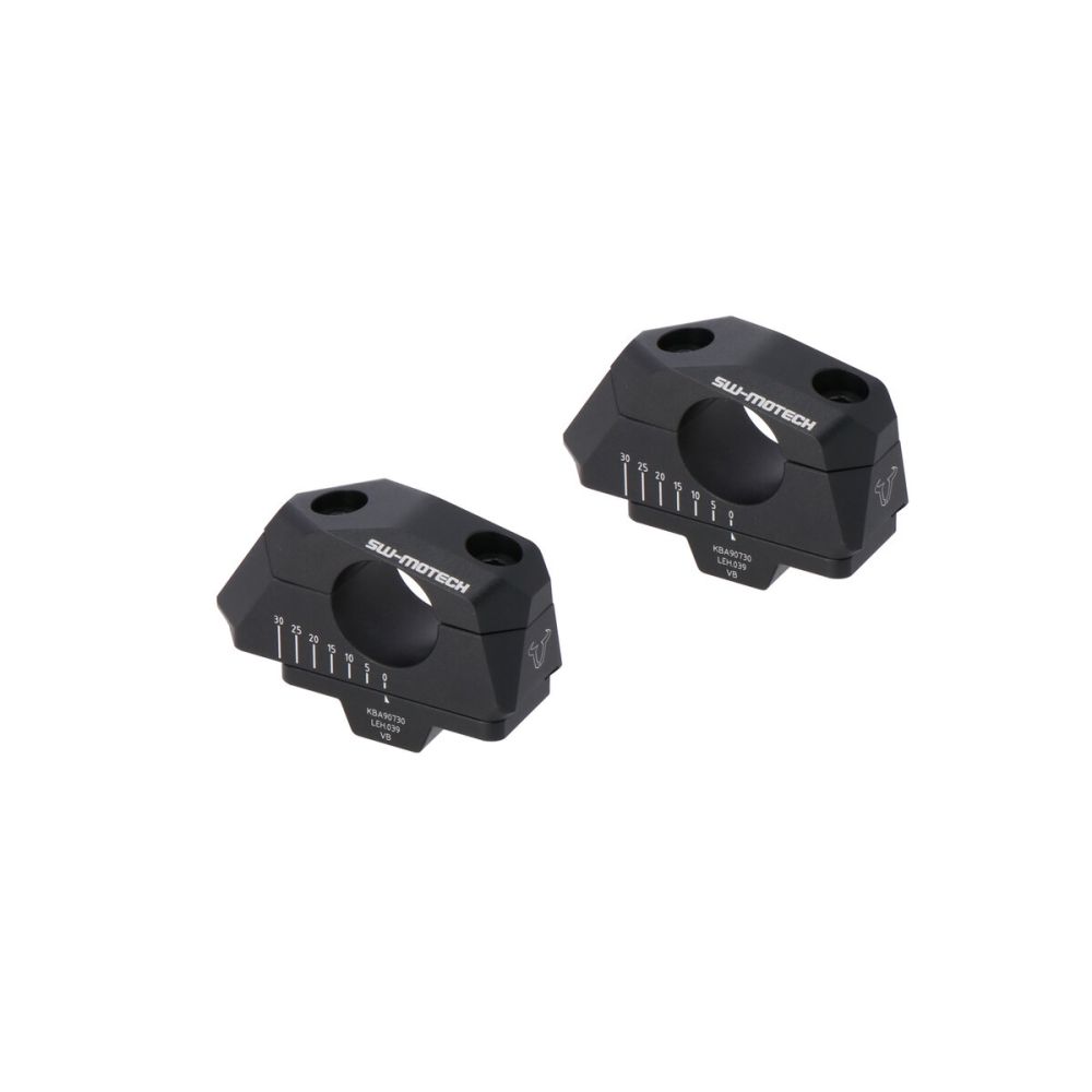 SW-Motech handlebar risers increase by 30mm upwards and adjustable proximity of 0-30mm for 32mm handlebars, black.