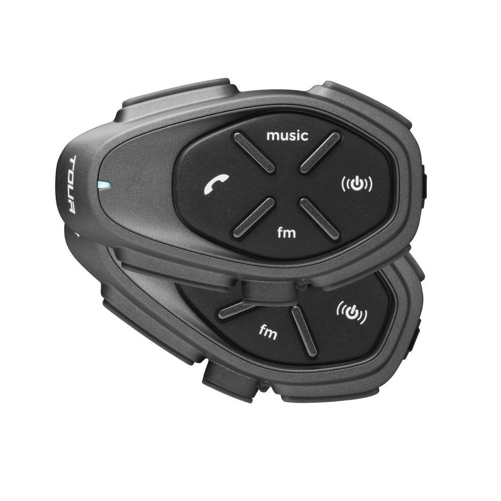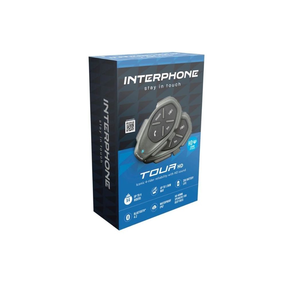 Interphone TOUR is the top product from the new line of intercom systems by Cellularline. The high level of construction and the new, elegant shape create the black, titanium body of the Interphone unit. The Interphone TOUR can connect up to 4 motorcyclists and has a maximum range of 1.5 km. It is compatible with all smartphones featuring Bluetooth technology, allowing you to make calls with your companions, listen to music, or receive instructions from GPS navigation. Thanks to the 40mm HD speakers and improved sound optimization software, the headphones deliver very high-quality sound with strong and deep bass while listening to music. The Interphone TOUR is compatible with all helmets, and installation on the helmet is very quick and easy. It is completely waterproof, its battery has a record endurance of up to 20 hours, and it charges very quickly thanks to FAST CHARGE technology. The Interphone TOUR combines advanced technology, stunning design, and user-friendly controls, making it ideal for long journeys.